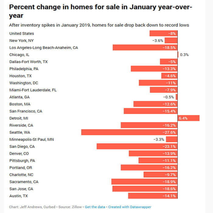 Offices Even before COVID-19, office spaces were increasingly becoming compact and flexible. Many companies encouraged employees to work from home. In the current scenario, working from home is the only option most companies have, especially in places where entire countries are under lockdown. Employers are looking at smaller office footprints in future, with the support of telecommuting service providers such as Slack and Zoom. The need for co-working spaces will likely see a decline. As people practice social distancing more prominently, the allure of leasing a co-working space could diminish. Innovation would be the only chance to survive for such companies. Housing and home building While housing has not seen a steep decline yet, homebuilders are feeling the heat. Potential visitors have pulled back from open houses, and the material supply from China has also slowed down significantly. Seattle, one of the world’s tech hubs, has seen a dramatic increase in home prices. However, the sale percentage dropped to a steep 27.6 percent year-over-year in January. Other cities aren’t better off. Supply is at an all-time low, while demand is incredibly high. This means that prices will continue to rise, despite sales dropping drastically. In the West Coast, the sales dropped lower in 2019 than the double-digit scores in 2018. See for yourself: [Credits: Datawrapper]